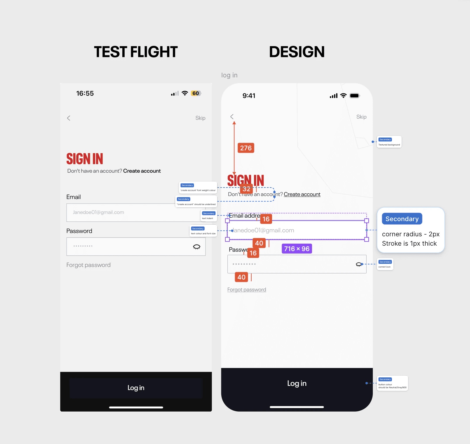 Before Launch, I did some design QA with the devs to ensure the built of the app were consistent with designs.